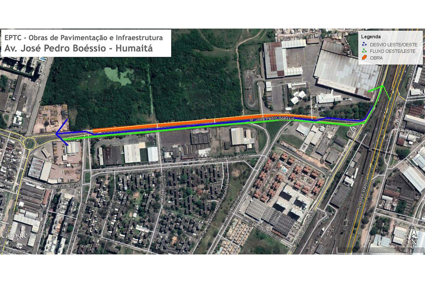 Foto: EPTC/PMPAA EPTC (Empresa Pública de Transporte e Circulação) informa que, a partir das 9h desta segunda-feira (16), a pista sentido leste/oeste da avenida José Pedro Boéssio, no bairro Humaitá, será bloqueada para o trânsito de veículos no trecho compreendido entre a av. Ernesto Neugebauer e a av. Palmira Gobbi, por um período de três meses para execução de obras de pavimentação e infraestrutura.