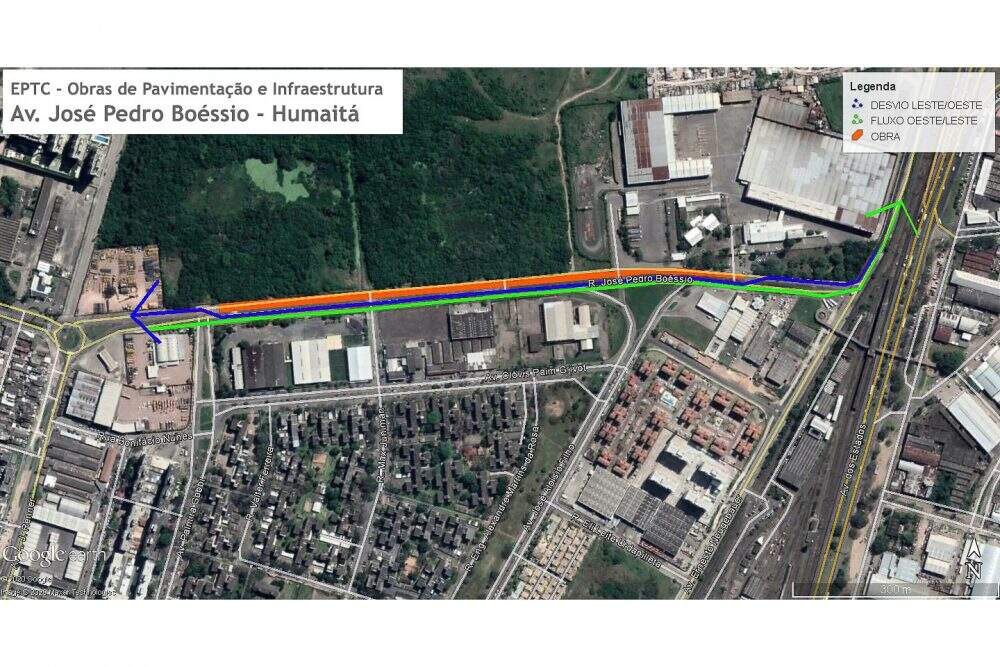 A EPTC (Empresa Pública de Transporte e Circulação) informa que, a partir das 9h desta segunda-feira (16), a pista sentido leste/oeste da avenida José Pedro Boéssio, no bairro Humaitá, será bloqueada para o trânsito de veículos no trecho compreendido entre a av. Ernesto Neugebauer e a av. Palmira Gobbi, por um período de três meses para execução de obras de pavimentação e infraestrutura.