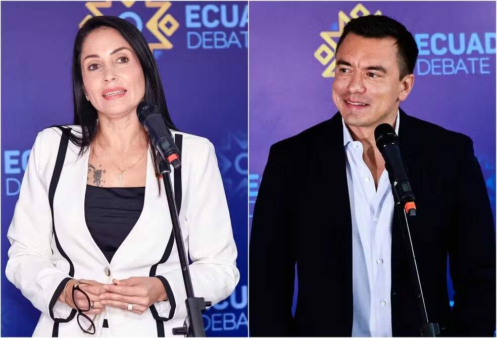 Foto: ReproduçãoO presidente Daniel Noboa, de centro-direita, e a opositora Luisa González, de esquerda, disputarão um acirrado segundo turno das eleições presidenciais neste domingo (13) no Equador – um país endividado, dividido e imerso na violência do tráfico de drogas.