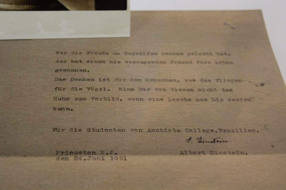 Uma mensagem escrita pelo físico Albert Einstein há mais de 60 anos foi resgatada do cofre de uma escola de Porto Alegre. O documento foi datilografado e assinado pelo físico a pedido do padre jesuíta Gaspar Dutra, que passava temporada de estudos nos Estados Unidos. Com o crescimento do nazismo na Europa, o cientista, que era judeu, se refugiou em território americano, onde veio a morrer em abril de 1955.