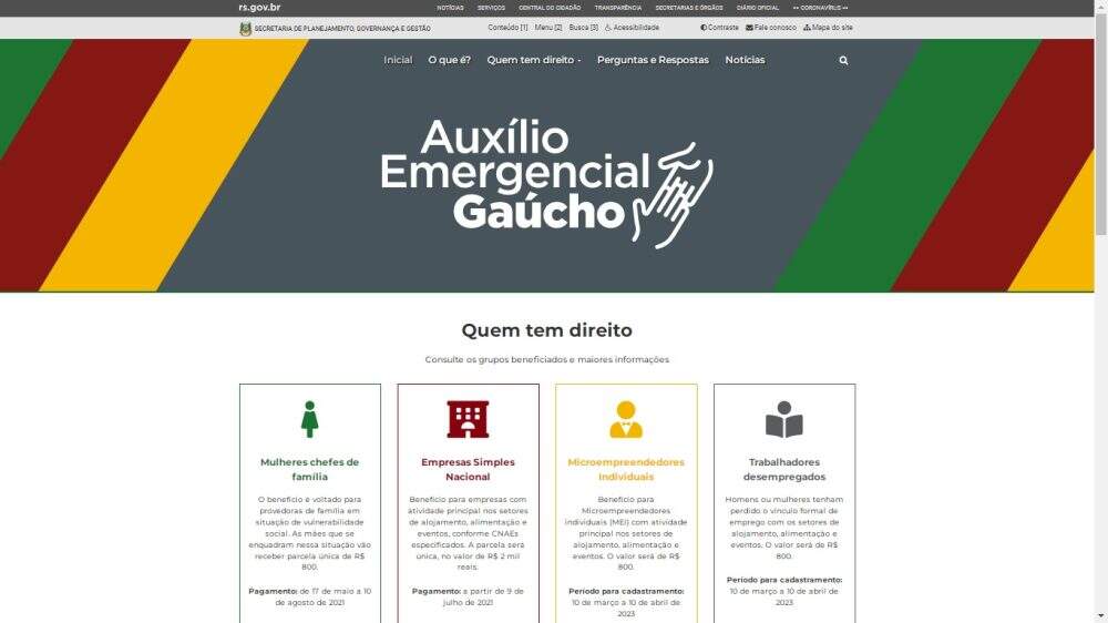O governo do Estado iniciará, em 10 de março, a terceira etapa do Auxílio Emergencial Gaúcho, com o cadastramento de estabelecimentos e profissionais formais desempregados dos setores de alojamento, alimentação e eventos do Rio Grande do Sul, afetados por restrições durante a pandemia do coronavírus. Nas duas primeiras etapas do Auxílio, realizadas em 2021, os grupos beneficiados foram mulheres chefes de família e empresas do Simples Nacional, com atividade principal nos setores de alojamento, alimentação e eventos.