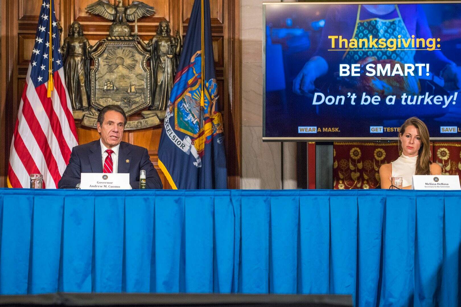 Recentemente o governador Andrew Cuomo, de Nova York, deu uma coletiva de imprensa sobre coronavírus, onde a campanha dizia: “Ação de Graças: Seja esperto! Não seja um peru”, em alusão ao costume norte-americano de preparar peru assado para o feriado.