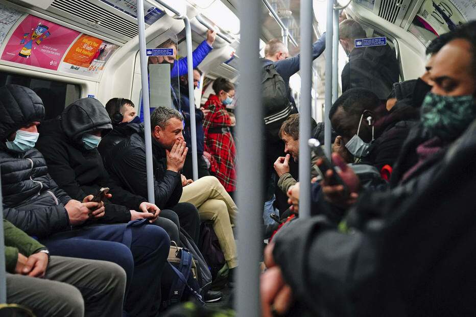 Passageiros em metrô de Londres em horário de rush, alguns com máscaras, outros não.