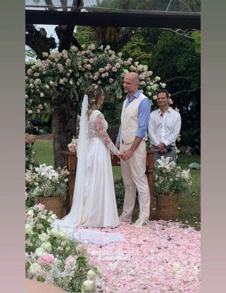 O casamento foi ao ar livre, com caminho de pétalas brancas para a chegada da noiva. Xuxa foi conduzido ao altar pela atriz e chef Isabella Scherer, sua filha mais velha. Ela esteve com o marido, Rodrigo Calazans, e os filhos gêmeos, Mel e Bento. Isa também fotografou alguns momentos da cerimônia, realizada em Floripa para que os pais do noivo, os empresários Rosalba Scherer e Antônio Carlos Scherer, já idosos, pudessem ir.