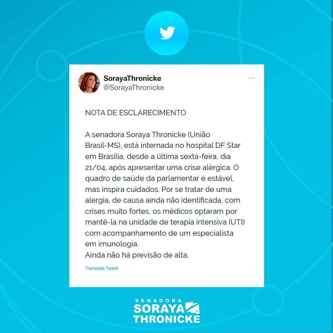 Na quarta (26), a equipe da senadora divulgou uma nota afirmando que o quadro de saúde dela é “estável, mas inspira cuidados”. De acordo com o texto divulgado nas redes sociais, Soraya teve uma alergia de causa não identificada com “crises muito fortes”.