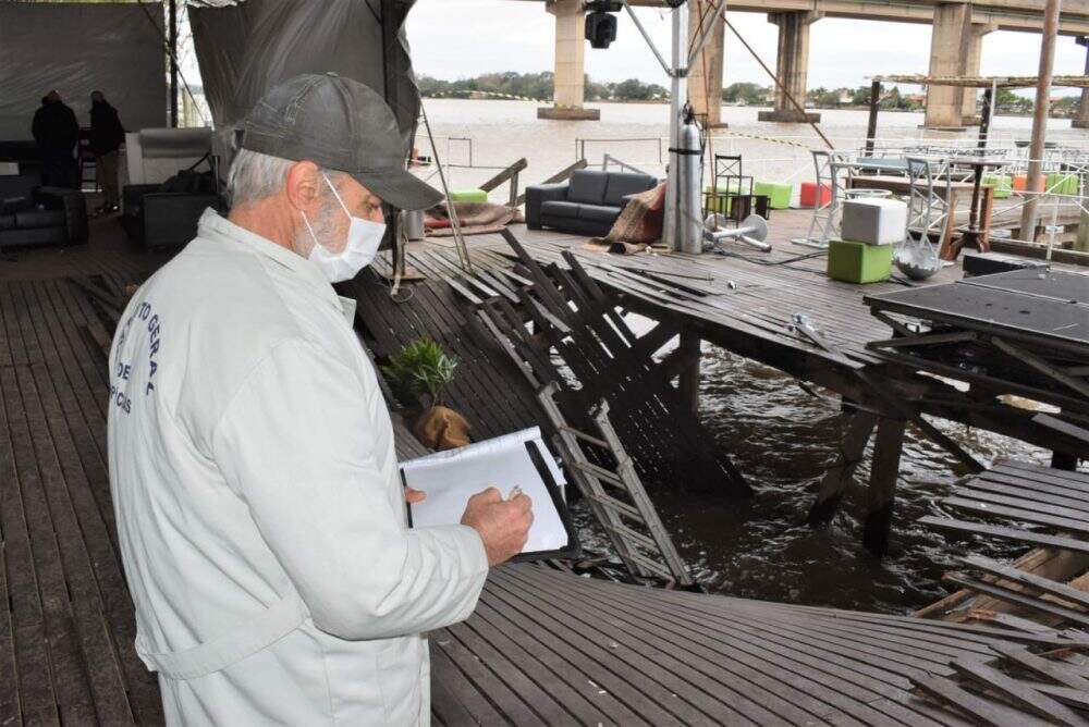 O deck que se rompeu, na noite de domingo (18), em um restaurante na Ilha das Flores, em Porto Alegre, passou por perícia na manhã desta segunda-feira (19). Uma jovem de 26 anos morreu após o desabamento.