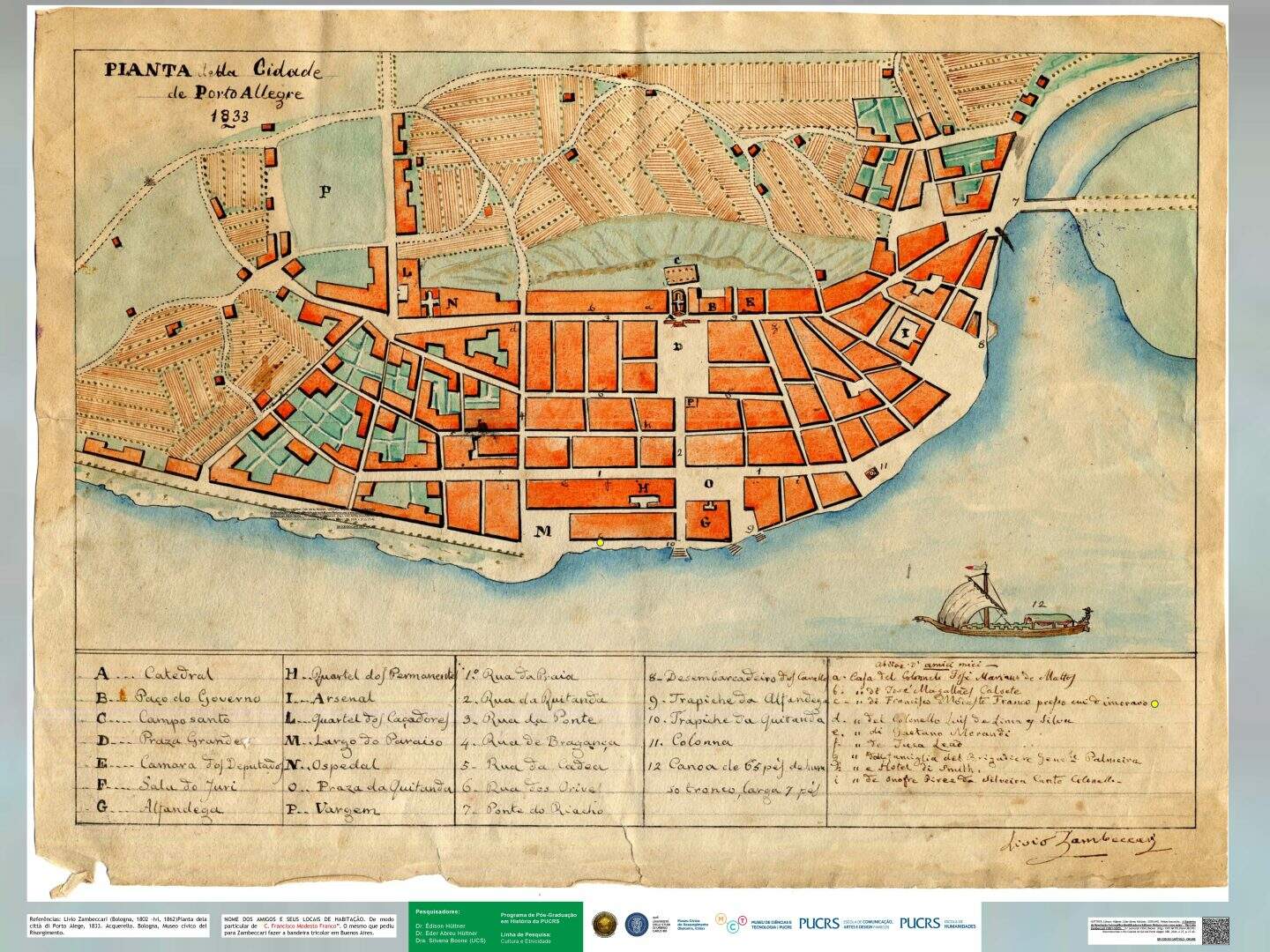 Com ampla formação educacional, Zambeccari foi naturalista, mas detinha, entre outros, conhecimentos artísticos, literários e políticos. Como geógrafo, fez a primeira planta baixa de Porto Alegre em 1833. O documento – que inclusive marca a residência de Manoel Franco na capital, certificando sua ligação com Zambeccari – é parte da exposição atual em Bolonha e uma réplica foi autorizada a compor a mostra na Câmara de Porto Alegre.