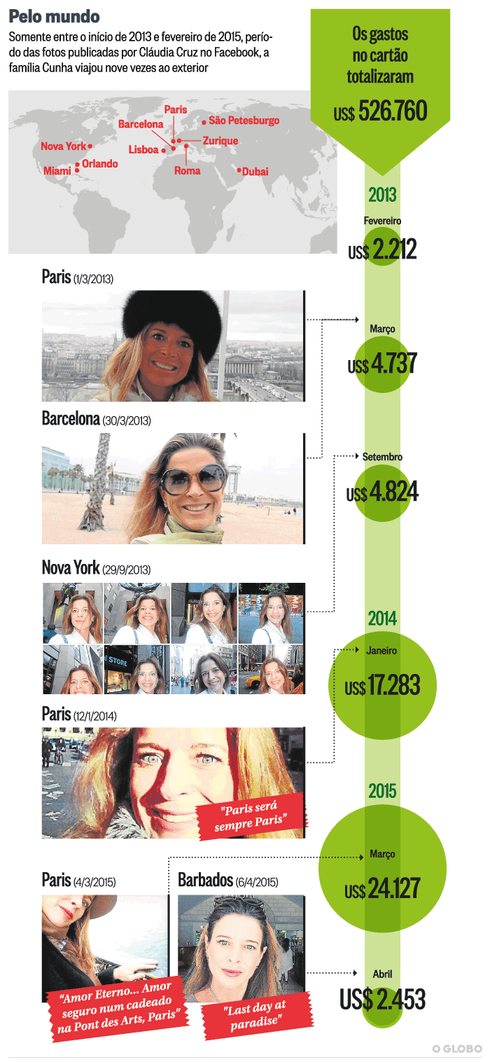 A família Cunha viajou nove vezes ao exterior entre 2013 e 2015, para destinos como Nova York, Miami, Orlando, Barcelona, Zurique, Paris, Roma, Lisboa, São Petesburgo e Dubai, com gastos nos cartões de crédito que totalizaram US$ 526.760 – Cunha e uma das filhas, Danielle, também tinham cartões internacionais. As faturas eram pagas com dinheiro da conta suíça Köpek, que, segundo a denúncia que tornou Cláudia ré na Lava-Jato, foi abastecida com recursos que vinham do petrolão.