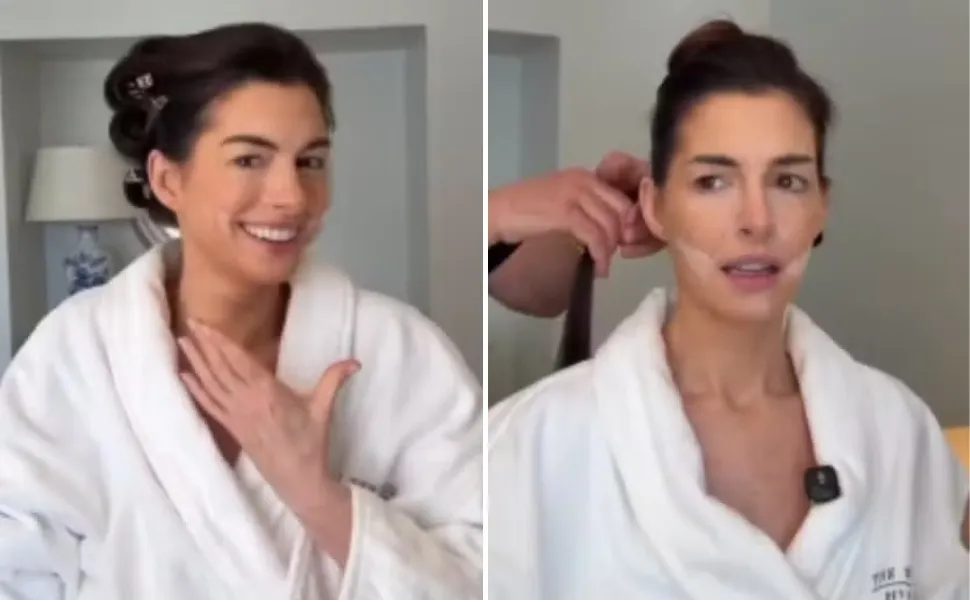 A atriz Anne Hathaway compartilhou nas redes sociais detalhes de sua preparação para o Oscar 2026 e revelou um truque para criar efeito de “facelift” sem cirurgia. Em vídeo gravado nos bastidores, ela aparece enquanto faz cabelo e maquiagem e explica como conseguiu o visual com aparência mais “esticada” no rosto.