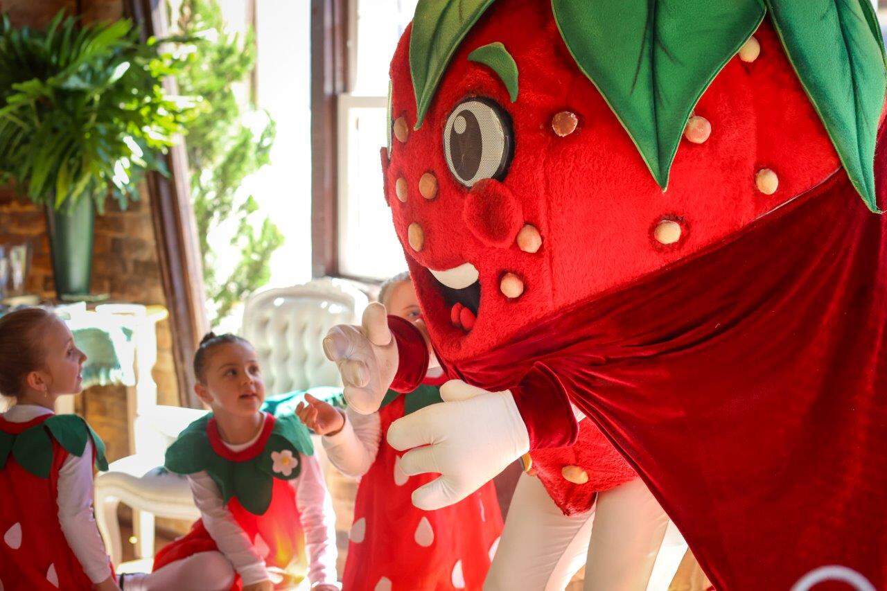 17- Mascote da festa – o Super M –, um morango gigante que brinca e posa para fotos na maior alegria.