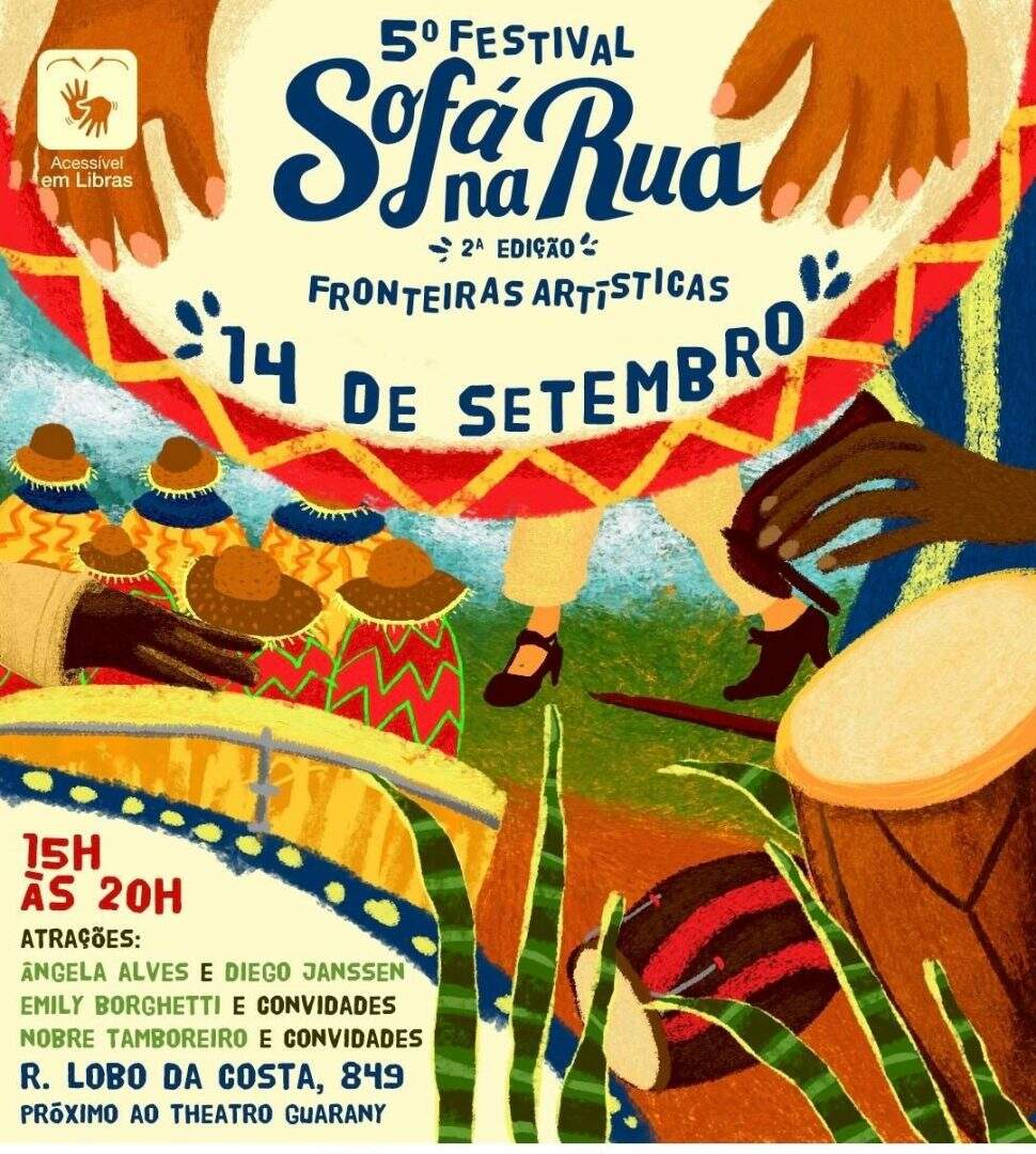 No domingo, das 15h às 20h, na Rua Lobo da Costa, 849 – em frente ao Theatro Guarany, é o local escolhido para o palco do 5º Festival Sofá na Rua – Fronteiras Artísticas, tendo em sua programação atrações autorais com identidades únicas, que vão de artistas nacionais e internacionais, vindos do Uruguai.