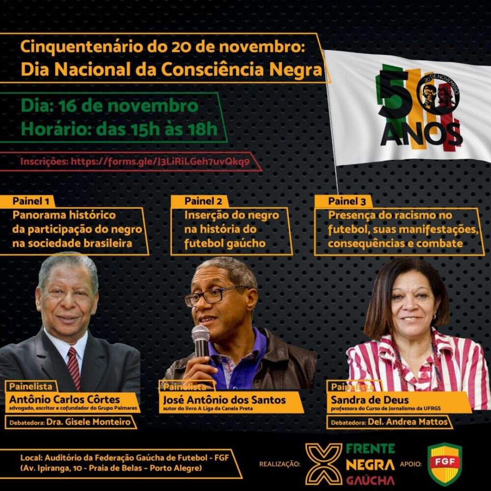 A Federação Gaúcha de Futebol (FGF) promoverá na próxima terça-feira (16), um evento em parceria com a Frente Negra Gaúcha sobre os 50 anos do dia 20 de novembro, instituído oficialmente como o Dia da Consciência Negra. Serão realizadas uma série de painéis e debates, das 15h às 18h, na sede da Federação.