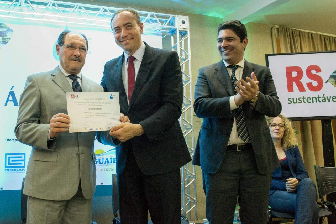 Governador Sartori recebeu diploma das mãos do diretor geral da Rede Pampa, Alexandre Gadret. Á direita, o secretário de Obras, Fabiano Pereira (Foto: Maia Rubim)Especial/O Sul