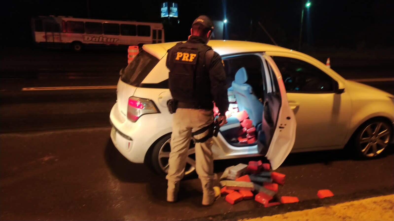 Os policiais também notaram um cobertor no banco traseiro e, ao removê-lo, encontraram diversos tabletes de maconha