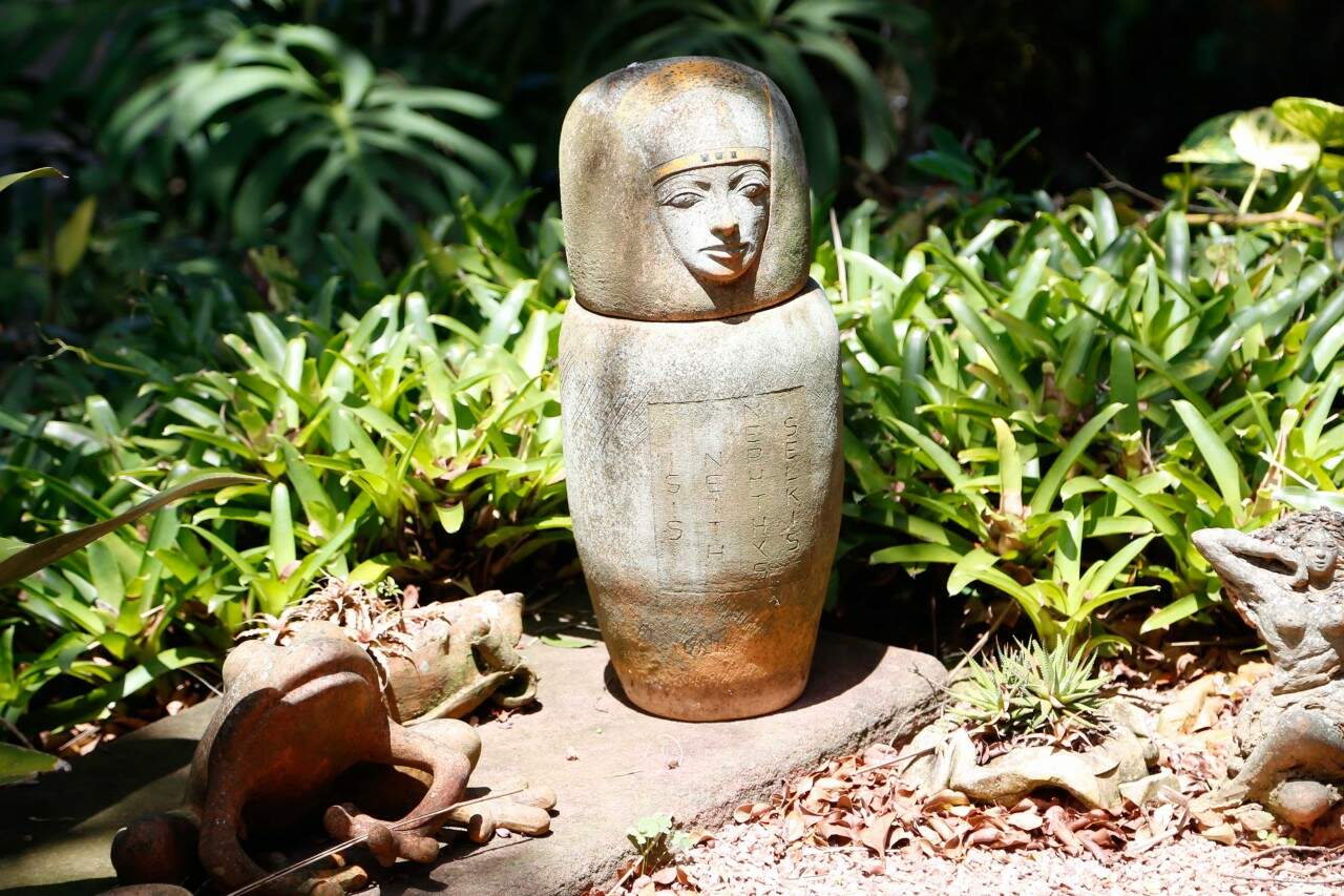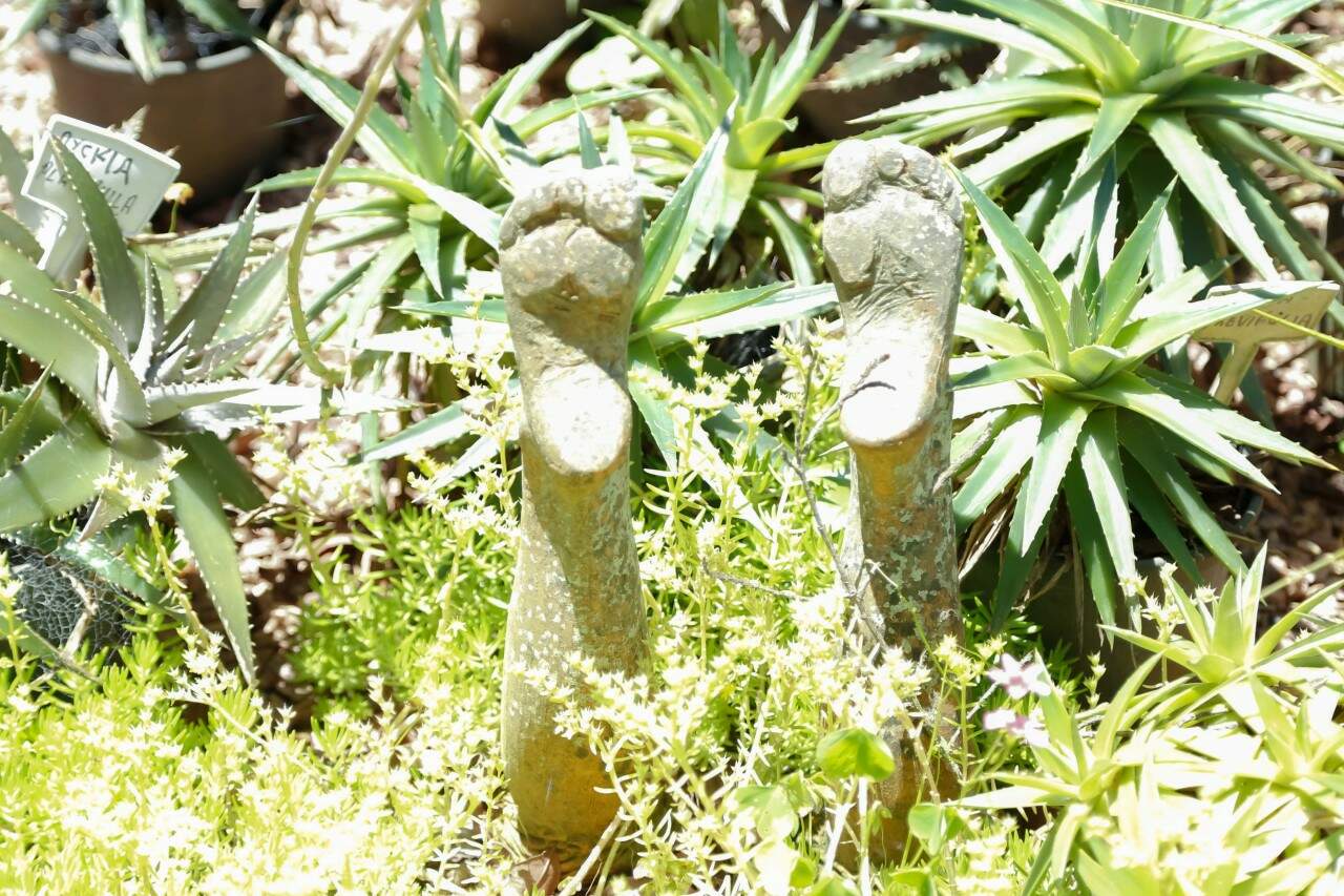 A escultura “Pernas” emerge entre as flores do orquidário Ricsel. (Foto: Lenara Petenuzzo/especial)