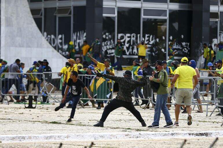 O grupo invadiu os prédios do Congresso Nacional, do Palácio do Planalto e do Supremo Tribunal Federal – as sedes dos três poderes da República – e vandalizou vidraças, mobília, documentos e obras de arte.