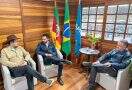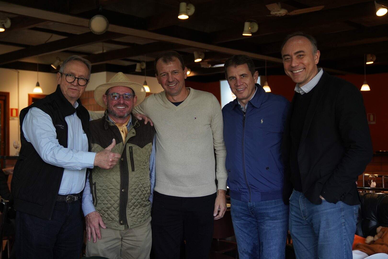 Fabiano Formagio, gerente comercial da empresa, ao centro, ao lado dos secretários do Turismo, Ronaldo Santini, e do Desenvolvimento Econômico, Ernani Polo, e dos presidente e vice da Rede Pampa, Alexandre Gadret e Paulo Sérgio Pinto.