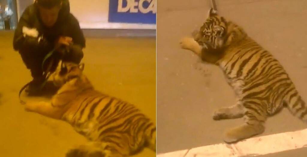 Um vídeo flagrou o momento em que um funcionário de circo bêbado leva um filhote de tigre para passear em um shopping na cidade de Ryazan, em Moscou (Rússia). As informações são do site Mirror. Nas imagens, é possível ver o animal amarrado a uma corda enquanto é provocado pelo homem. A gravação, publicada em um site local, acabou viralizando e o funcionário foi demitido.