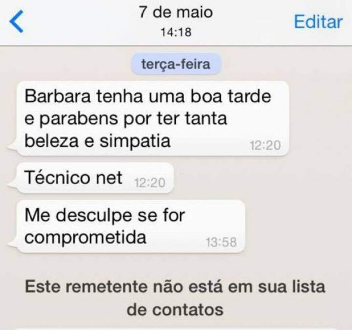A também jornalista Bárbara dos Anjos Lima contou que, no início deste mês, recebeu mensagens no WhatsApp de um técnico da NET que havia visitado sua casa para instalar um roteador de internet.