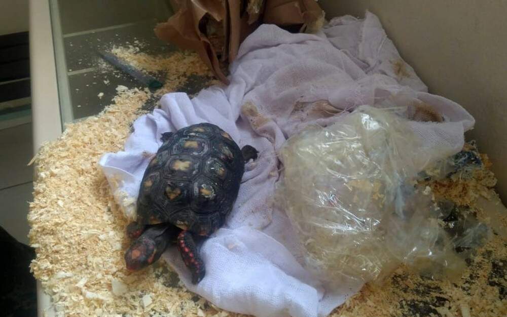 Um filhote de jabuti foi encontrado dentro de um pacote despachado em uma agência dos Correios, na segunda-feira (14), em Franca (SP). Segundo a Polícia Militar Ambiental, o animal estava preso em fita adesiva. Um homem suspeito de comprar o bicho foi multado em R$ 3,5 mil.