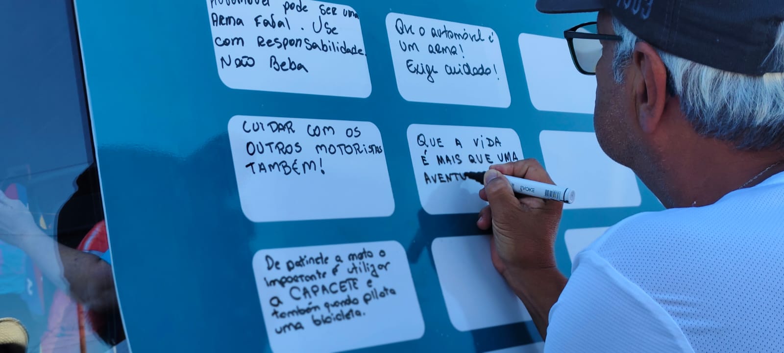 Outro ponto de interação foi um painel coletivo, onde os presentes eram convidados a escrever mensagens sobre o que diriam a seus filhos para se protegerem no trânsito. Entre as respostas, uma chamou atenção pela simplicidade e profundidade: “Cuidar dos outros motoristas também.”