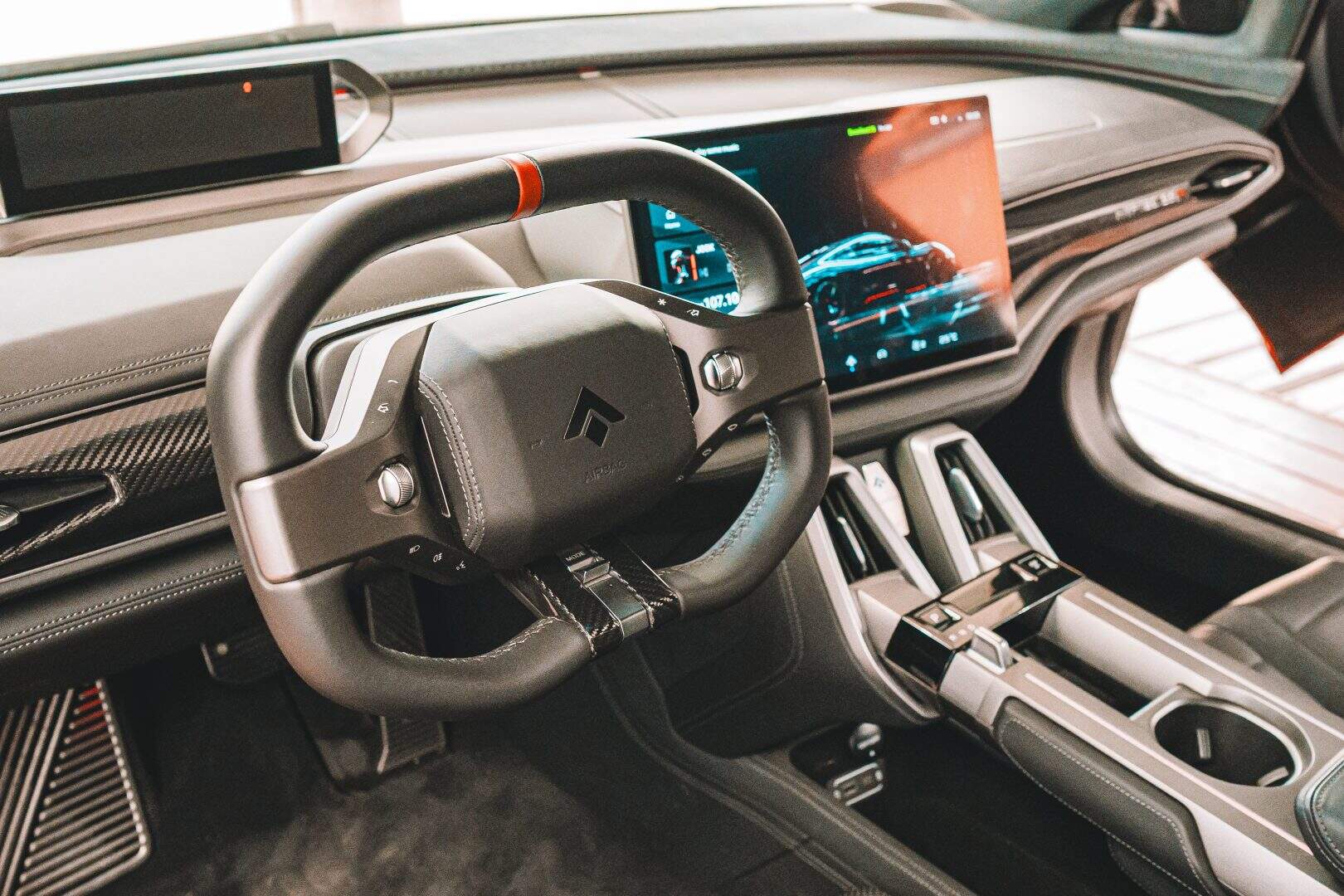 Sob o capô (ou melhor, sob o assoalho), a configuração impressiona: três motores elétricos — um dianteiro de 435 cv e dois traseiros de 394,5 cv cada — entregam potência combinada de 1.224 cv e torque instantâneo de 127,5 kgfm. O conjunto é gerenciado por uma transmissão de duas marchas nos motores traseiros, solução que ajuda o SSR a cumprir o 0 a 100 km/h em apenas 1,9 segundo, segundo dados de fábrica.