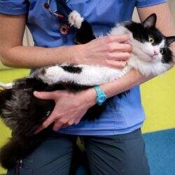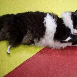 Pooh, de longo pelo negro e branco, que ainda está na clínica veterinária, hoje brinca como qualquer gato de sua idade com suas patas artificiais.