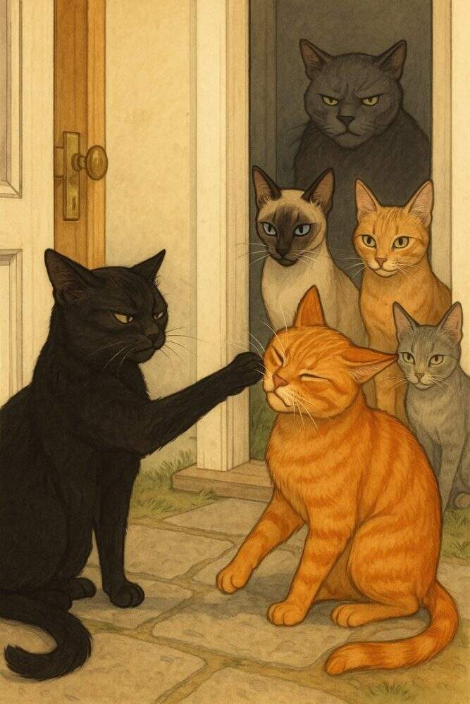Mas a rua tem regras próprias. Dos telhados surgiram os veteranos: gatos grandes, marcados, experientes. Thor avançou primeiro. Brutos veio logo atrás, confiante.