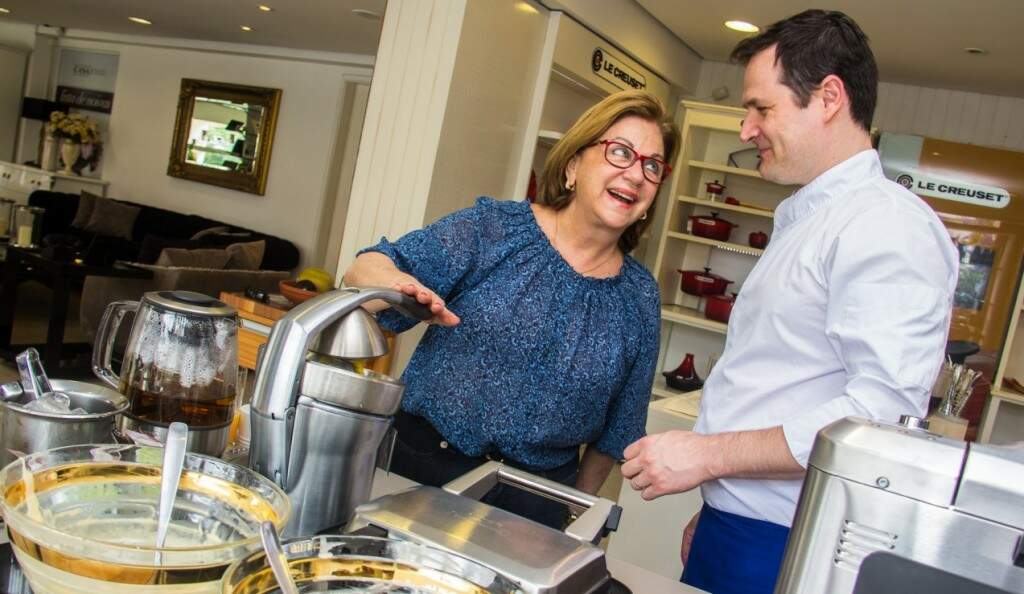 Marlene Wolf e o chef Mauro Gigolani: degustação de pães e wafles na apresentaçã da nova linha Tramontina by Breville. (Foto: Jackson Ciceri/O Sul)