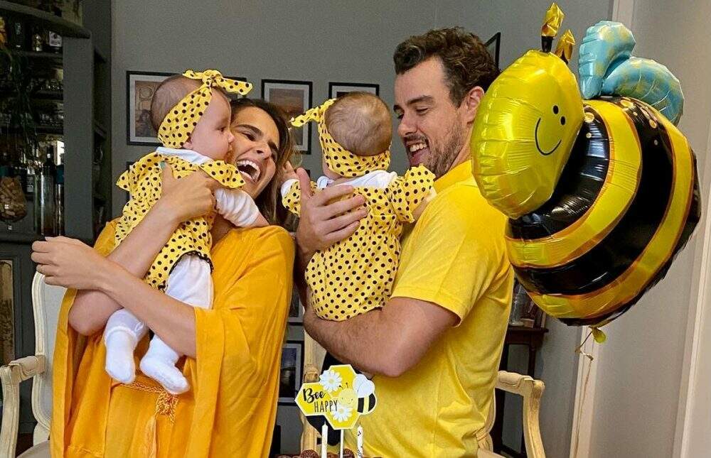 A cantora Marcella Fogaça e o ator e apresentador Joaquim Lopes comemoraram os sete meses das filhas gêmeas, Sophia e Pietra, com uma festinha temática superfofa: de abelhinhas. E, claro, vestiram as garotinhas a caráter!