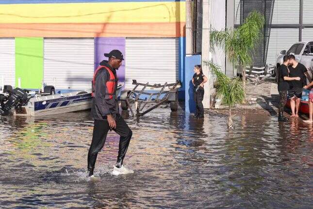 Vídeos que circulam nas redes sociais mostram o goleiro junto com amigos em cima de uma moto aquática. Com uma corda, eles ajudaram moradores a deixar um prédio tomado pela água na Zona Norte da Capital.