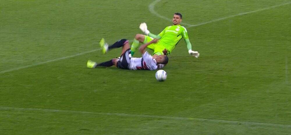Já nos acréscimos da primeira etapa, aos 46 minutos, o goleiro recebeu o recuo do zagueiro Gabriel Mercado, que poderia ter rifado a bola ao invés do passe de longa distância. Porém, acabou traído pelo campo molhado e deixou a bola escapar. Alisson aproveitou, driblou e acabou derrubado por Keiller.