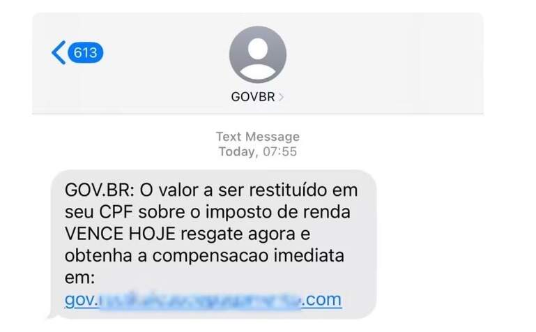 Tudo começa em um SMS com um alerta falso de que o valor a ser restituído no Imposto de Renda está prestes a vencer e que, para o contribuinte receber o pagamento imediatamente, é preciso clicar em um link.