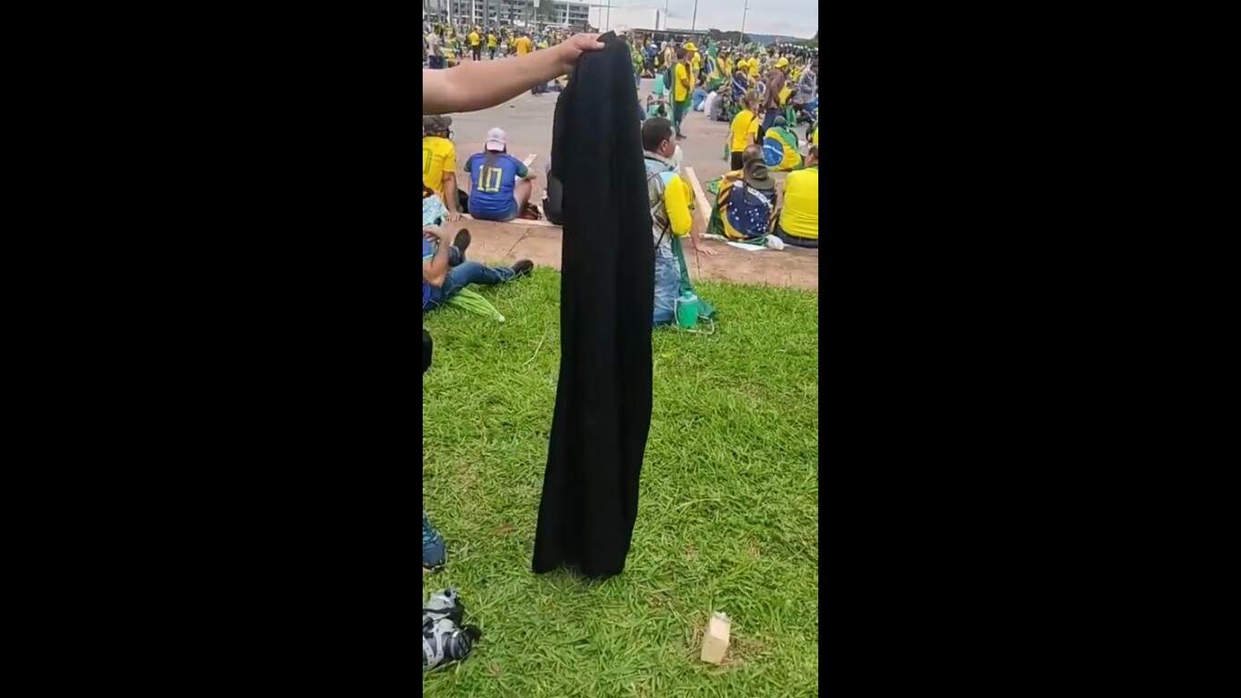 Em vídeo que circula nas redes sociais, um extremista, que está em um gramado na Esplanada, exibe a peça de roupa preta