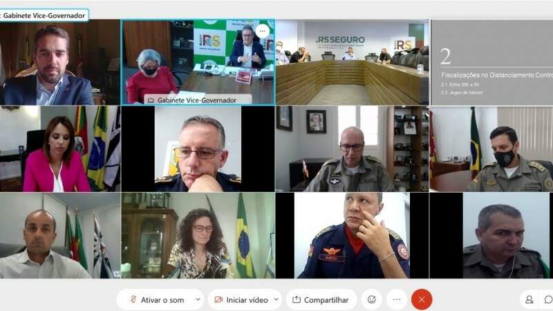 Foto: ReproduçãoO governador Eduardo Leite participou nesta terça-feira (23), via videoconferência, de reunião semanal das instituições da Secretaria da Segurança Pública (SSP). Coordenada pelo vice-governador e secretário da Segurança Pública, delegado Ranolfo Vieira Júnior, o encontro virtual teve destaque especial para o planejamento de fiscalização da suspensão geral de atividades no Rio Grande do Sul das 20h às 5h, pelo menos até amanhecer do dia 2 de março.