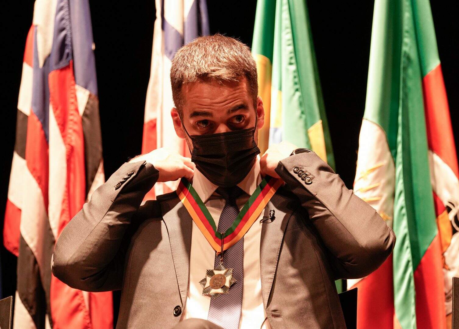Foto: ALRSO governador Eduardo Leite recebeu, nesta quarta-feira (23), a Medalha do Mérito Farroupilha, mais alta honraria concedida pela Assembleia Legislativa gaúcha. A outorga da homenagem foi proposta pelo deputado estadual Frederico Antunes, líder do governo no parlamento.