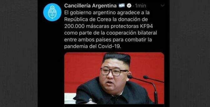 O Ministério das Relações Exteriores da Argentina cometeu uma gafe em sua página oficial no Twitter. Em uma postagem de agradecimento à Coreia do Sul pela doação de máscaras para proteção contra o coronavírus, a chancelaria usou uma foto do ditador da Coreia do Norte e desafeto de Seul, Kim Jong-un.