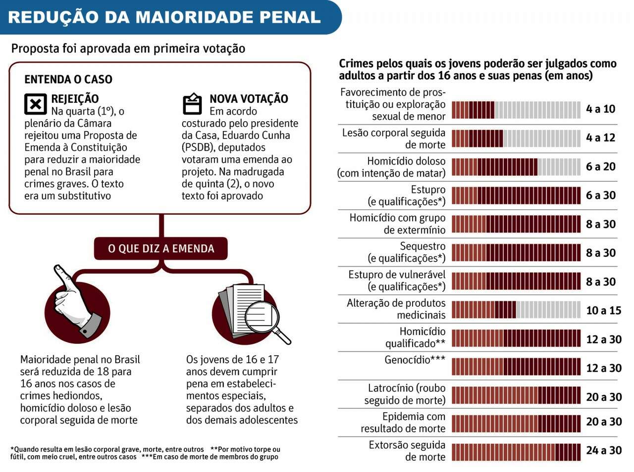O texto aprovado na madrugada de quinta-feira prevê baixar a idade penal em casos de crimes hediondos, como estupro e sequestro, homicídio doloso, aquele com intenção de matar, e lesão corporal seguida de morte.