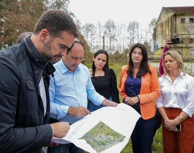 Após a vistoria do terreno, Leite e os secretários de Habitação e Regularização Fundiária, Carlos Gomes, da Educação, Raquel Teixeira, de Logística e Transportes, Juvir Costella, de Obras Públicas, Izabel Matte, e da Reconstrução Gaúcha, Pedro Capeluppi, foram até a Escola Estadual Adelina Isabela Konzen.