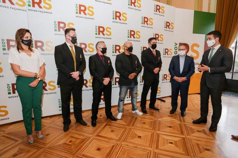 Foto: Felipe Dalla Valle / Palácio PiratiniO Salão Alberto Pasqualini, no Palácio Piratini, foi palco da entrega de medalhas por atos de bravura a cinco servidores da Polícia Civil. Ganharam a honraria o comissário de polícia Gilmar Antônio Santos da Fontoura, o escrivão Rodrigo Falcão Nuhrich e os inspetores Pedro Sidnei Couto Vieira, Laion Wolf e Silvio Daniel Santos.
