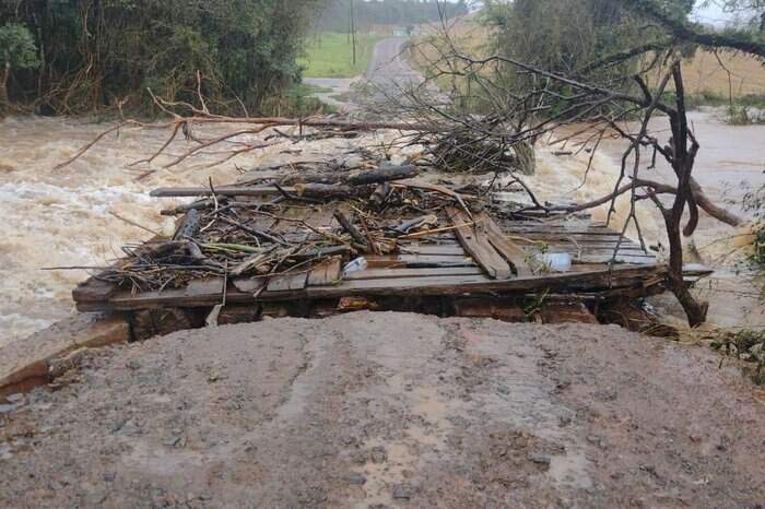 Em alguns municípios, há pontes submersas ou interditadas. As enxurradas provocaram também a ruptura da ponte que liga Farroupilha a Nova Roma, com a queda de uma das cabeceiras.