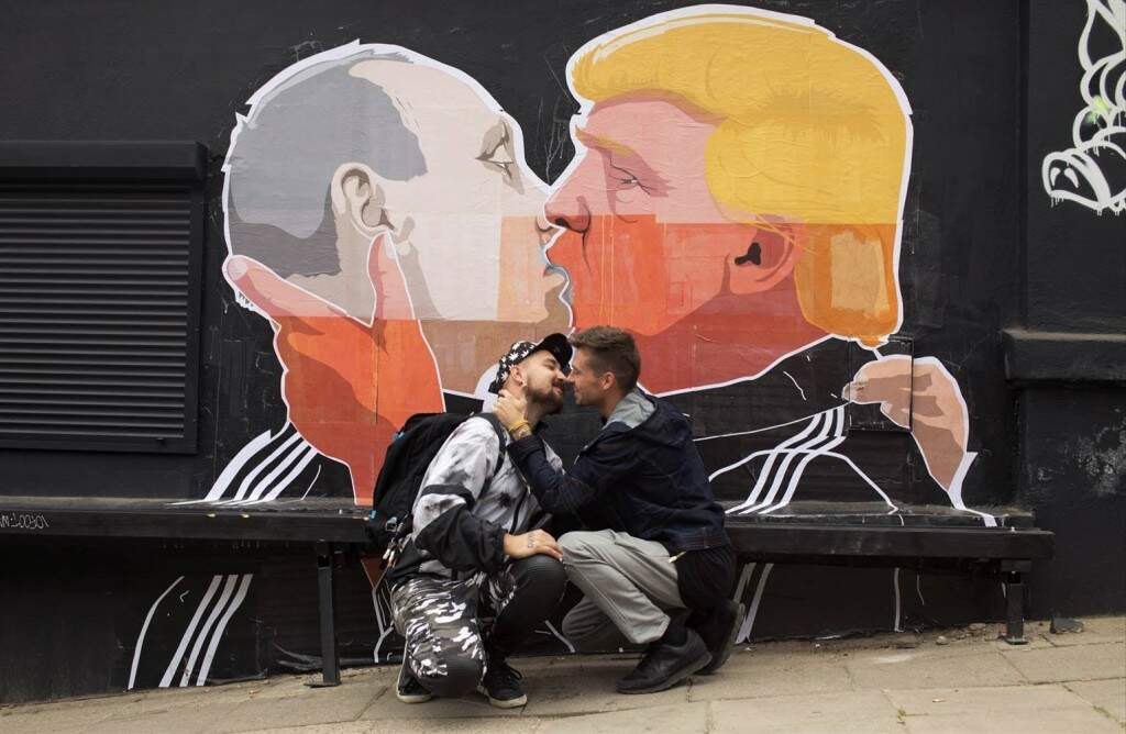 Um grafite de rua que mostra Donald Trump e Vladimir Putin se beijando na boca se tornou viral na Lituânia, onde os temores sobre uma possível aproximação crescem.