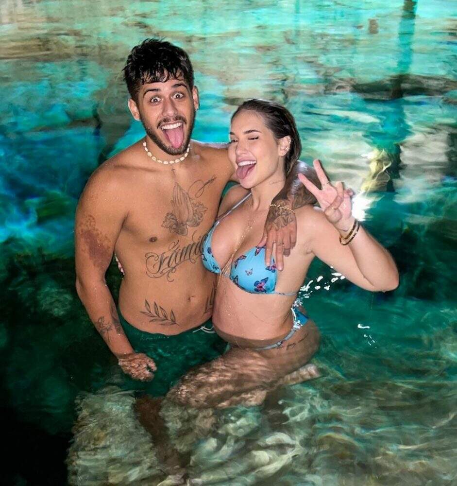 Dentro de uma das belas grutas de Cancún, o casal posou fazendo caras e bocas e mostrando que está aproveitando a viagem. “Curtindo cada segundo”, disse a influencer, no sexto mês de gestação. “Ser feliz é uma decisão”, acrescentou Zé Felipe.