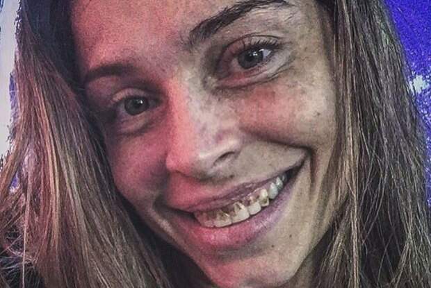 Na imagem, Grazi exibe os dentes sujos e a pele manchada. Na novela das 23h, a atriz vive uma modelo viciada em drogas.