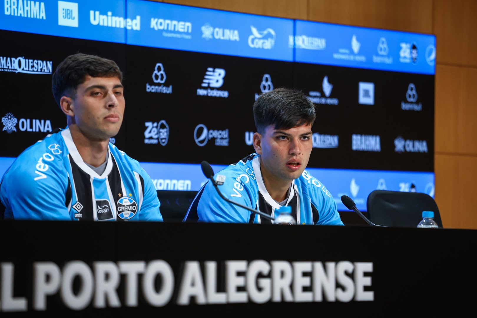 O Grêmio apresentou oficialmente, nessa sexta-feira (13), seus dois novos reforços para a temporada: os meio-campistas argentinos Juan Nardoni e Leonel Pérez. A coletiva de apresentação foi realizada no auditório da Arena do Grêmio, com a presença da imprensa e de dirigentes do clube.