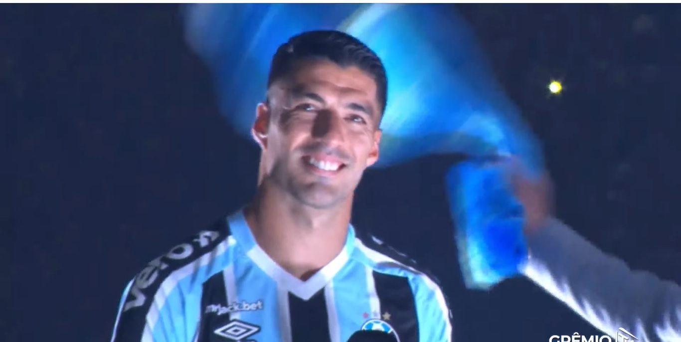 Foto: Reprodução/GrêmioA noite desta quarta-feira (4) ficará na memória do torcedor gremista, data em que Luis Suárez foi apresentado a mais de 30 mil pessoas na Arena do Grêmio, em Porto Alegre. Com bandeiras do Brasil e do Uruguai, luzes, DJ, shows pirotécnicos e um palco no meio do gramado em estilo europeu, o novo camisa 9 recebeu o carinho dos seus novos torcedores.