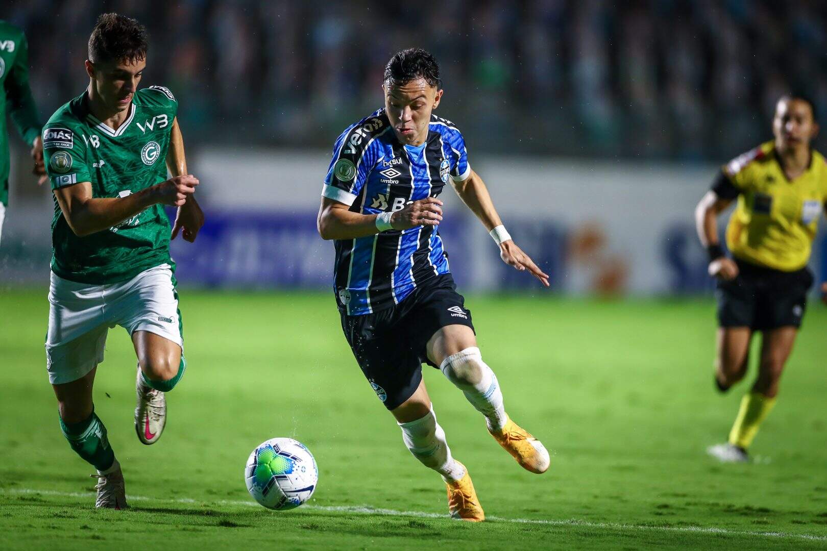 Aos 6’, o Tricolor tentou pela direita, com um cruzamento na pequena área. Churín tentou girar e finalizar, mas Ariel Cabral colocou para escanteio. Já três minutos depois, após boa trama gremista, Orejuela recebeu na direita e chutou cruzado, levando perigo a meta goiana, mas a bola saiu à direita do gol.