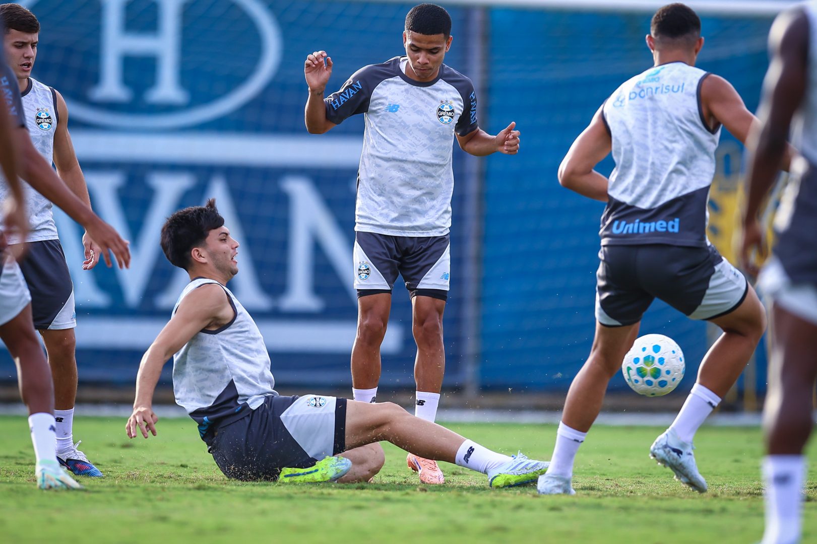 A primeira parte da atividade foi voltada à preparação física, com corrida, alongamentos, arranques, saltos e movimentos laterais. Depois, os atletas realizaram exercícios de troca de passes ao redor do círculo central.