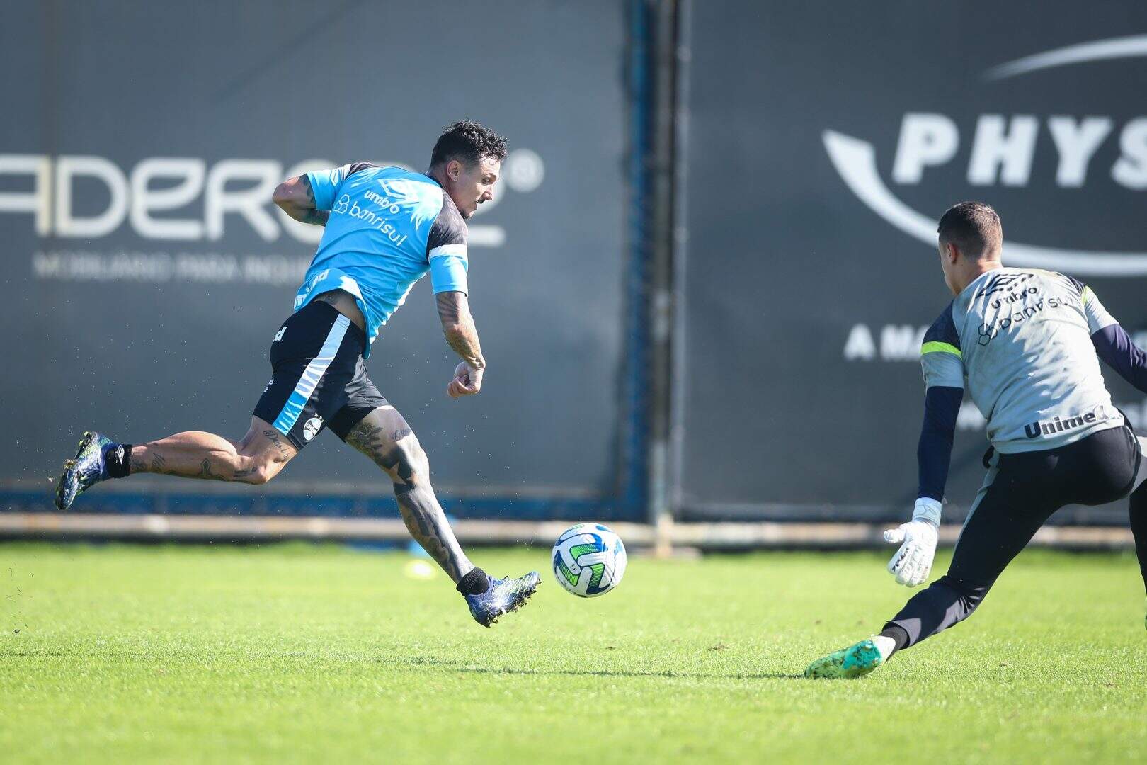Na última parte do treinamento, os atletas participaram de finalizações com revezamento entre os jogadores que cruzavam para chegada de dois outros na área para concluir, exigindo muito dos goleiros gremistas.