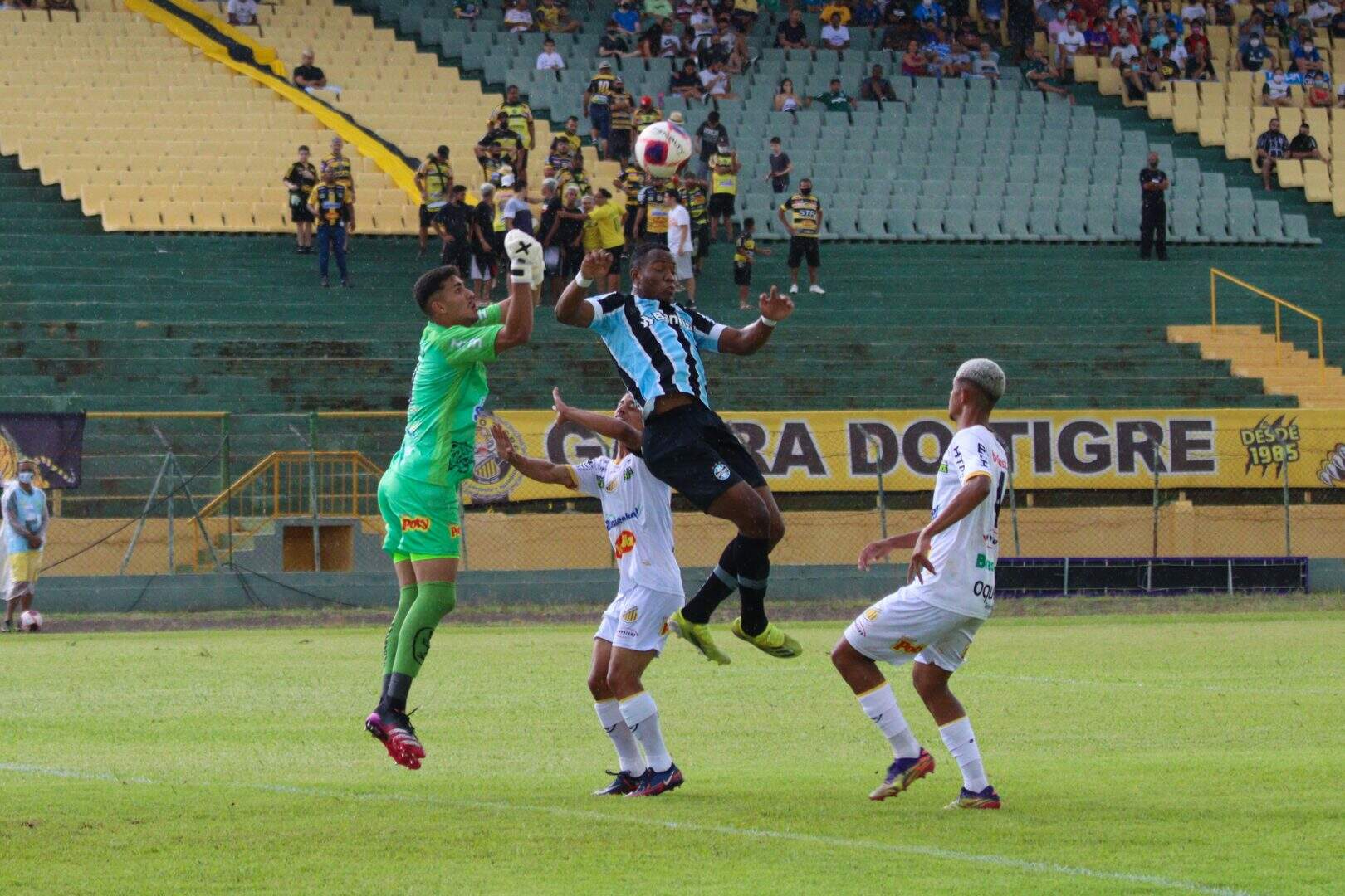 Aos 13 minutos, em jogada rápida de transição, o atacante paulista recebeu no comando para dar um corte na zaga e chutar rasteiro da entrada da área gremista, ao lado da trave esquerda. Oito minutos depois, após cruzamento da esquerda, a bola foi na segunda trave para a testada cruzada firme do avante do Novorizontino. O goleiro Thiago Beltrame saltou para espalmar e salvar o que seria o gol inaugural do jogo.